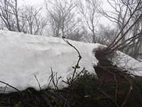 蓬莱山頂付近は、立っているのが”やっと”でしたが、下山してくると少し弱まってきた。積雪時は、琵琶湖側に雪が張り出すので、内側にトレースが付けられていた。雪解でクマササが立ち塞ぎ既に通れなくなり、谷きわの夏道に戻っていました。また、木肌がかなり痛んだ木も、雪から開放され元気を取り戻していた。