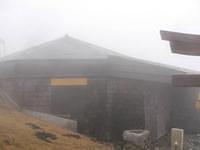 視界が数mのなか、山の神休憩所を探しだし飛び込んだ。温かいお茶を飲み、昼食をとりながら体力の回復を図った。