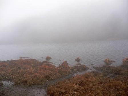 伝説のある小女郎ケ池は、ガスに包まれより一層神秘的になっていた。対岸に渡ることが出来ほどの氷が張っていたが、既に、周辺はクマ笹に覆われ、水が強風にあおられ波立っていた。風が収まると不気味なほど、静まり返った。