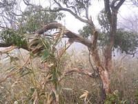 ガスで視界悪い 雪で木肌がかなり痛んだ木