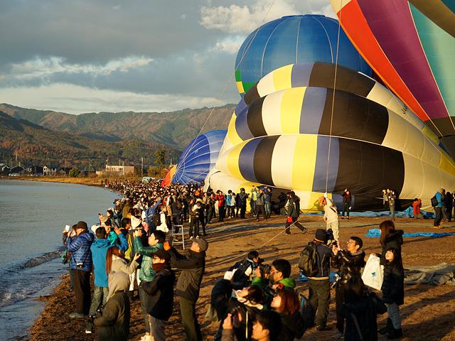 バルーン愛好家達は、使い込まれた球皮を広げる人、籐で編まれたゴンドラを無造作に運搬車から運び出す人、バーナーの試運転で爆音をさせている人、各自それぞれ気ぜわしく動いていた。多分、天候もよく、穏やかな北西の季節風が吹き、対岸の東近江市まで辿りつくと、運営委員が判断したのであろう。