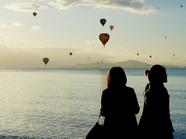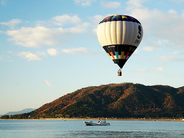 熱気球が朝日を浴びて琵琶湖へ