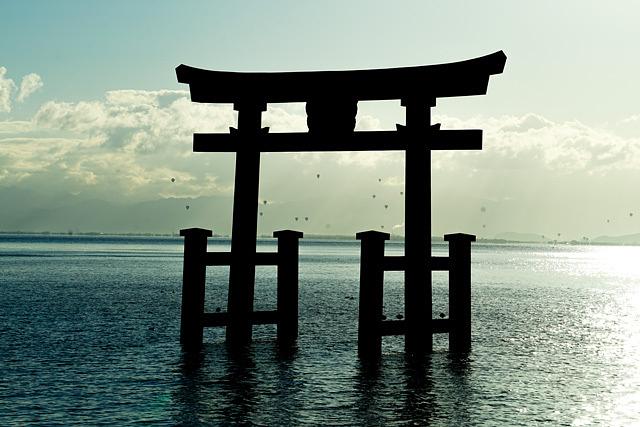 白鬚神社の鳥居から熱気球を望む