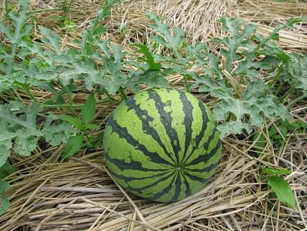 スイカ作りは、やたらと手間がかかります。スイカ作りに限らず土作り、ツルが伸びたら3~4本に絞り、着果作業、株の周辺に追肥、敷きわら、水やり、玉の回転などすることが色々あります。ところで、スイカの栽培は難しくなく、放任しても、それなりのものが出来るのですが…。