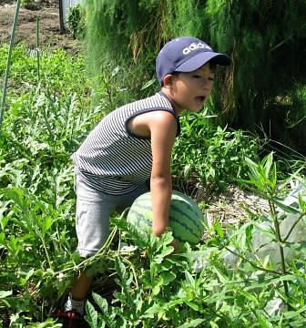 3mX2.5mの面積に念のため2株を植えますが、どちらか優れた方を育て、他方を間引きして、ゆったりと育てることです。せこせことした育て方をしないほうが、美味しく巨大なスイカが収穫できます。
