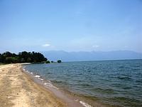 湖岸道路からマイアミ浜オートキャンプ場の松林に入って行った。今まで、自家用車やトラックが引っ切り無しに走っている騒音が嘘のようにかき消され、寂々となった。そこに広がっていた光景は、沖島と雄大な比良山系を背景に、青松の素晴らしい白砂が展開していた。