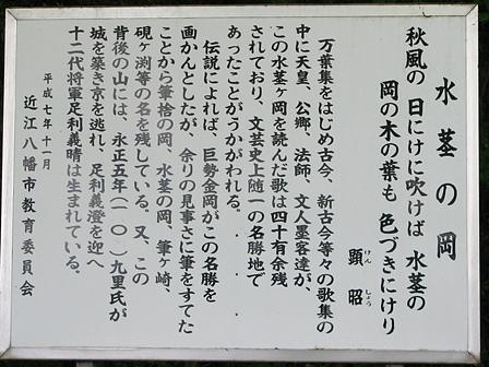 昔、「水茎の岡」一帯は内湖に囲まれており、湖中に浮いていた。だが、戦後、食糧増産の名のもとに水茎内湖は拓地として埋め立てられてしまった。陸続きとなって、万葉集に詠まれ面影も薄く、今は、表示板の中に書いてある「名勝地」の文字が空しい。ここ万葉の故地は、セイルに風を受けて楽しむウィンドサーフィンの若者達が訪れるところに異変していた。