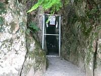 更に、湖岸道路に戻って北に向かった。・家棟川・日野川を渡って、長い直線道路を進みと、正面に小高い山が見えた。道路は二つの山の間を通り抜けていくが、道路を外れて、左側に湖岸沿いの細い道に踏み入った。右手の奥に岩室があり、左手の小さな岬に藤ヶ崎龍神の社があった。 表示板には、「万葉集をはじめ古今・新古今に40首あまりも詠われた文芸上随一の名勝地であるなど・・・」と記されていた。