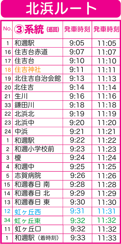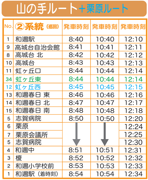 2)「虹ヶ丘」の停留所を2箇所に分割し「虹ヶ丘東」と「虹ヶ丘西」といたします。