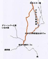 頂上までのルートは、2本ある。ひとつはゲレンデのリフトと平行に進んで主稜線を登るコースと、もう一つセンターハウス「じゃっぴー・らんど」を経由して右側の山手に向かうコース。何れも、さわらび草原道出合いP817mの地点から頂上に達する。