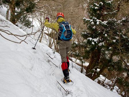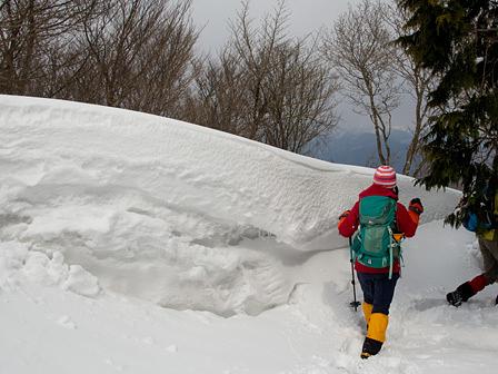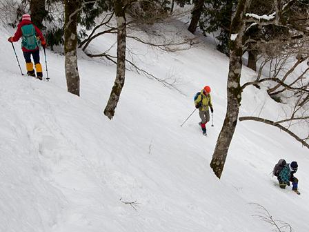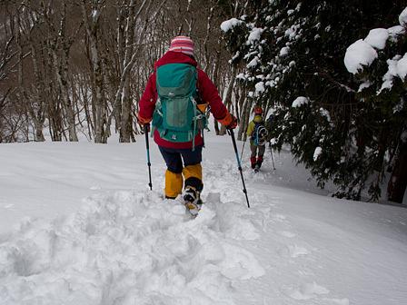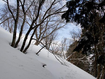 とにかく、雪崩の通り道になる谷筋を避けて、あっちこっちとルート探索を試みた。森林帯の入口辺りは雪の吹き溜まり状態であり、何回も足を踏み抜きながら、一歩、一歩と進めた。
