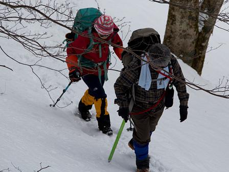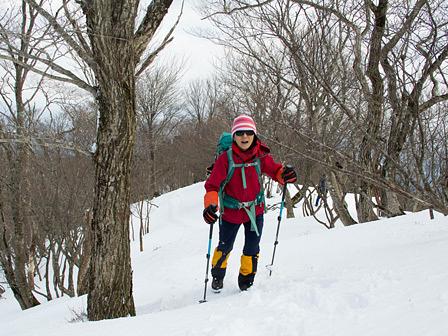 その内、赤テープの目印を見出し、ジグザグになって登っていくことがわかり、快調に高度をあげることが出来た。ワカンを取り付けたSさんが標高差250mのルートを道慣らしとルート探索を行った。頼りになる女性だ。