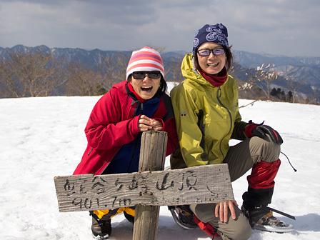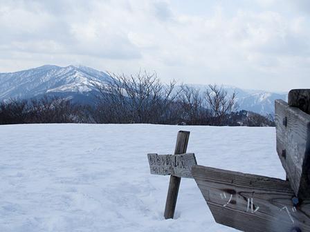 微かに頂上らしき山影を見つけ、そこを目指した。森林帯の雪質はずっしりとした感触だったのが、稜線上ではサラサラの粉雪となり、歩くごとに雪が舞い上がった。開放感に満ち、歩くピッチが上がった。p817mのさわらび草原道の分岐、グリーンパーク想い出の森・生きものふれあいの里からの合流点をいつの間にか通過し、最後の急登を一挙に登り切っていた。