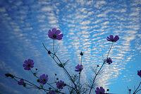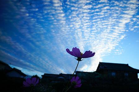 何かがお起こっていると思い、夕方になって、雲の様子を観察に出掛けた。朝と打って変わって西空から放射状の雲が、大空を覆いつくしていた。幸運にも、コスモス一輪を背景にして、放射状雲の写真が撮れた。