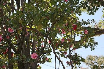 本陣入り口に大きな椿の木があり、根本から二つに分かれ、同じ木から5色の椿が花を付けます。