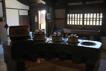 カマヤ(賄い土間)には当時を復元したかまどがあります。