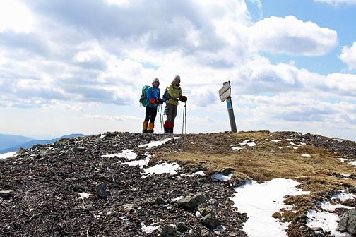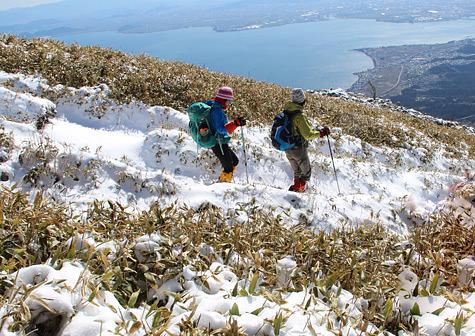蓬莱山頂上から大きくうねる丘陵のような頂が並び、たおやかな山容が薄っすらと白んでいた。 縦走路が、黒く跡形を残し、なだらかに延びていた。立ち入り禁止のロープを越えて、この日、山に分け入ったのは、我々ともう一組の3人連れパーティーだけだった。彼らは、小女郎ヶ池まで行き、引き返すと言っていた。