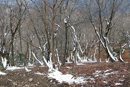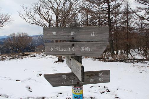 小女郎ヶ池からホッケ山・権現山と進むにつれて地肌が目についてきた。権現山は、比良山系の南の端にあり、これから山が終わろうとする位置にある。ここは、平と栗原・和邇駅との分岐点でもある。権現山からの下山ポイントは北緯35°11`29" 東経135°52`19”。 以前、この分岐点にある道標がすっぽり雪に埋まり、慌てたことがあった。だが、道標がむき出しであったので、GPSも無用であった。